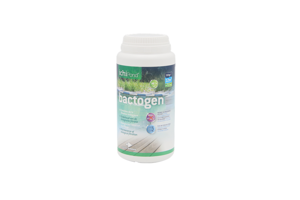 Mélange concentré de bactéries, d’enzymes, de minéraux et oligo-éléments, Bactogen est recommandé pour l’entretien de la filtration biologique durant presque toute l’année. Bactogen améliore la qualité biologique de l’eau ainsi que le cycle d’épuration des polluants organiques. A long terme, l’utilisation combinée de Bactogen et Biobooster+ avec nos aliments de haute qualité Ichi Food permet de réduire significativement la pollution organique responsable des phénomènes d’envasement, d’encrassement des filtres ou d’accumulation d’ammoniaque toxique pour les poissons. Convient pour piscine et bassin.