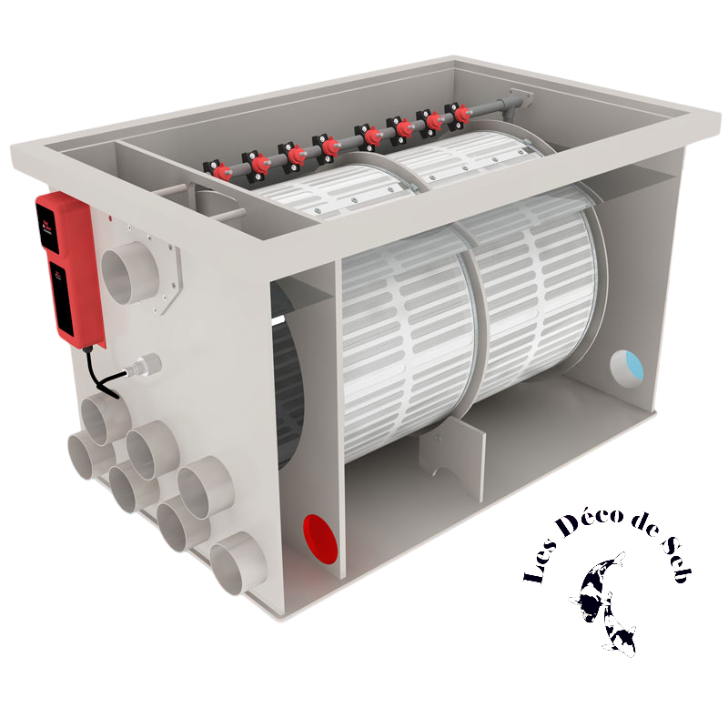 Le boitier de commande du Red label DRUM FILTER est équipé de 4 prises électriques ( pompe de rinçage, pompe bassin, UVC, moteur de tambour)